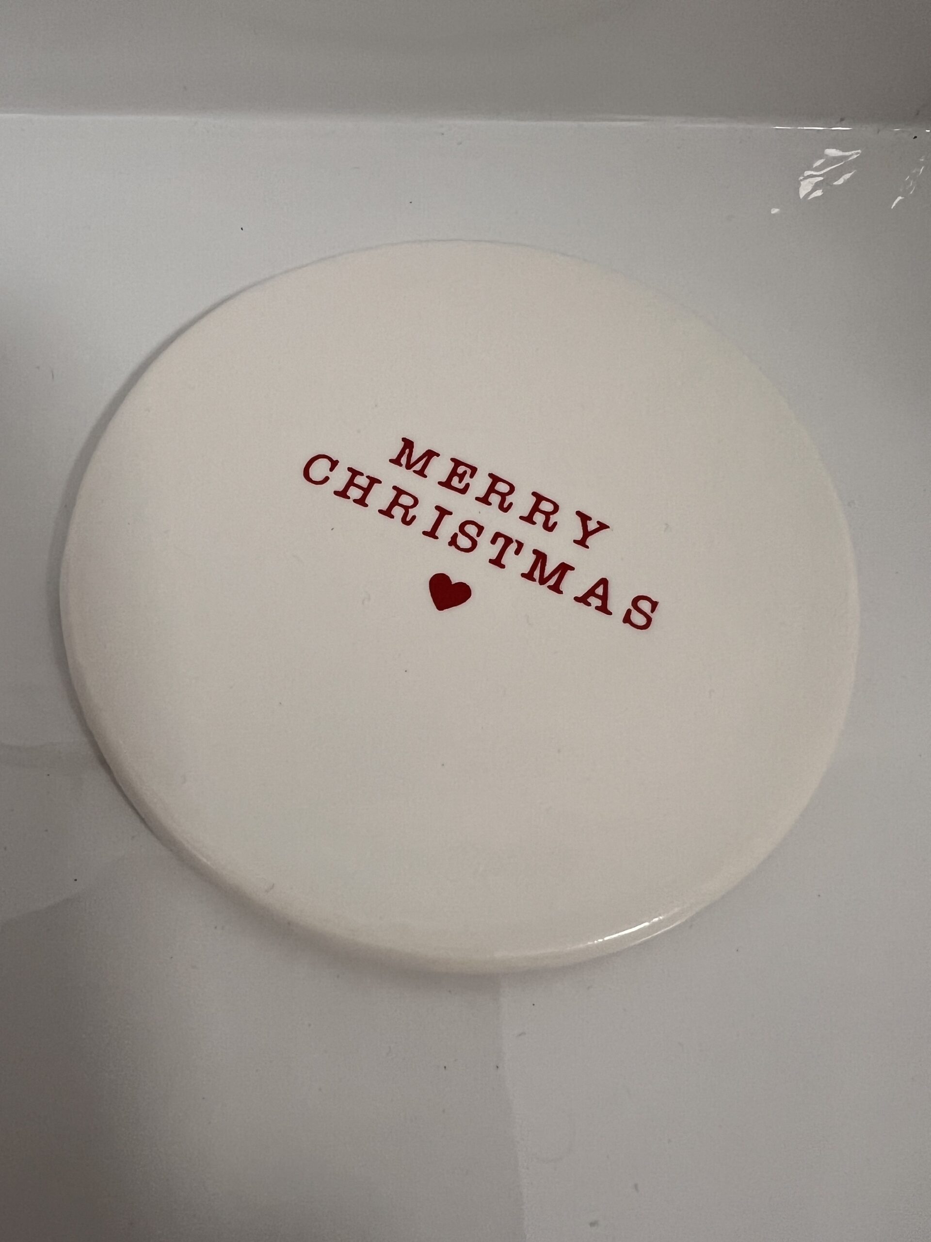 A delightful ceramic coaster embossed with the phrase “Merry Christmas” in a red font and complete with a dainty red heart. A perfect little gift for someone over the festive season.